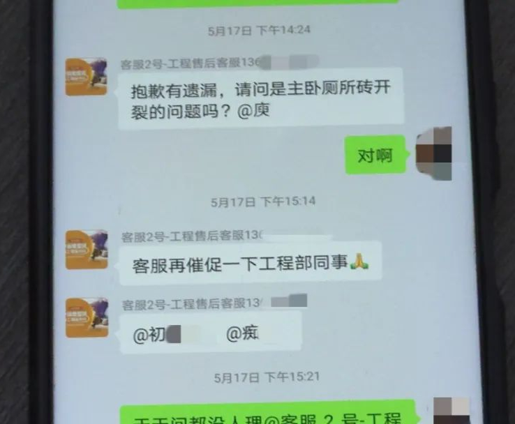当发现瓷砖开裂、空鼓的问题后,庾先生在装修公司的服务群里多次反映,但客服每次都说正在跟进处理,而且让庾先生一等就是三个多月,到现在也没人来说明到底是什么问题,应该如何处理。而在庾先生出示的装修合同中,关于建材的保修方式和明确的保修时间并没有写出来,另外装修公司的手机号码也没办法联系上。