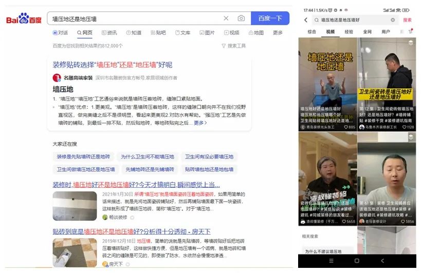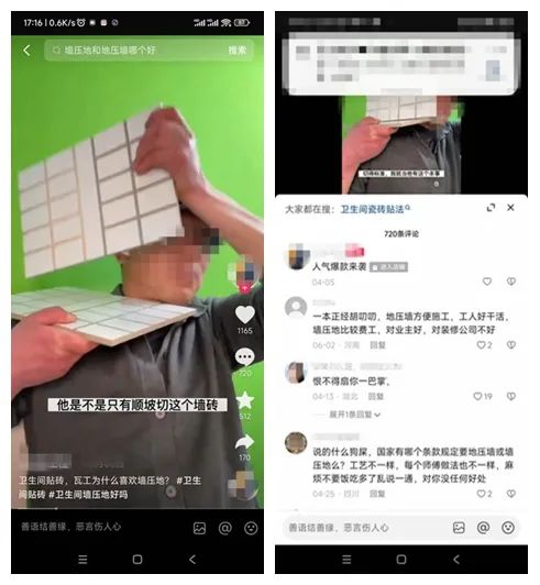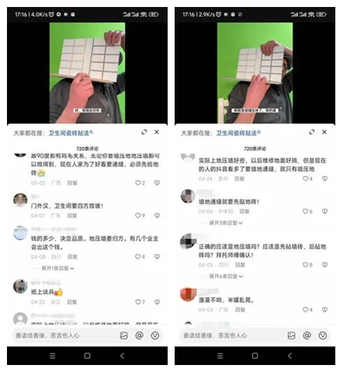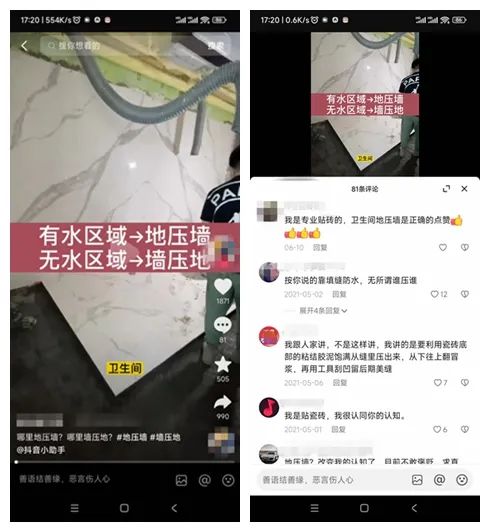 然而,这位专家提出的另一个观点却得到了很多人的赞同(同样见下面抖音截图拼图)。他是这样说的:有水区域“地压墙”,无水区域“墙压地”,墙砖跟地砖这一圈阴角缝至少要留出3毫米,以便以后填实止水。